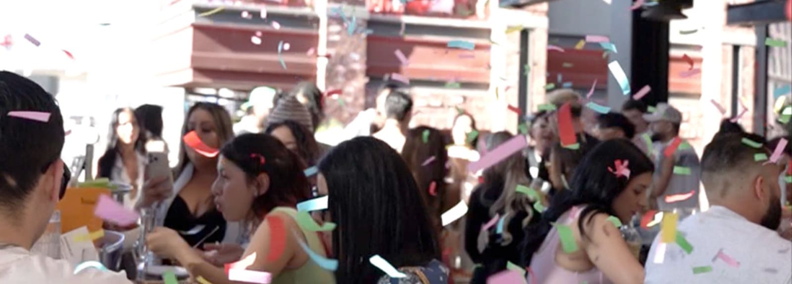 Guests dancing and taking photos during a lively daytime brunch party on an outdoor patio.